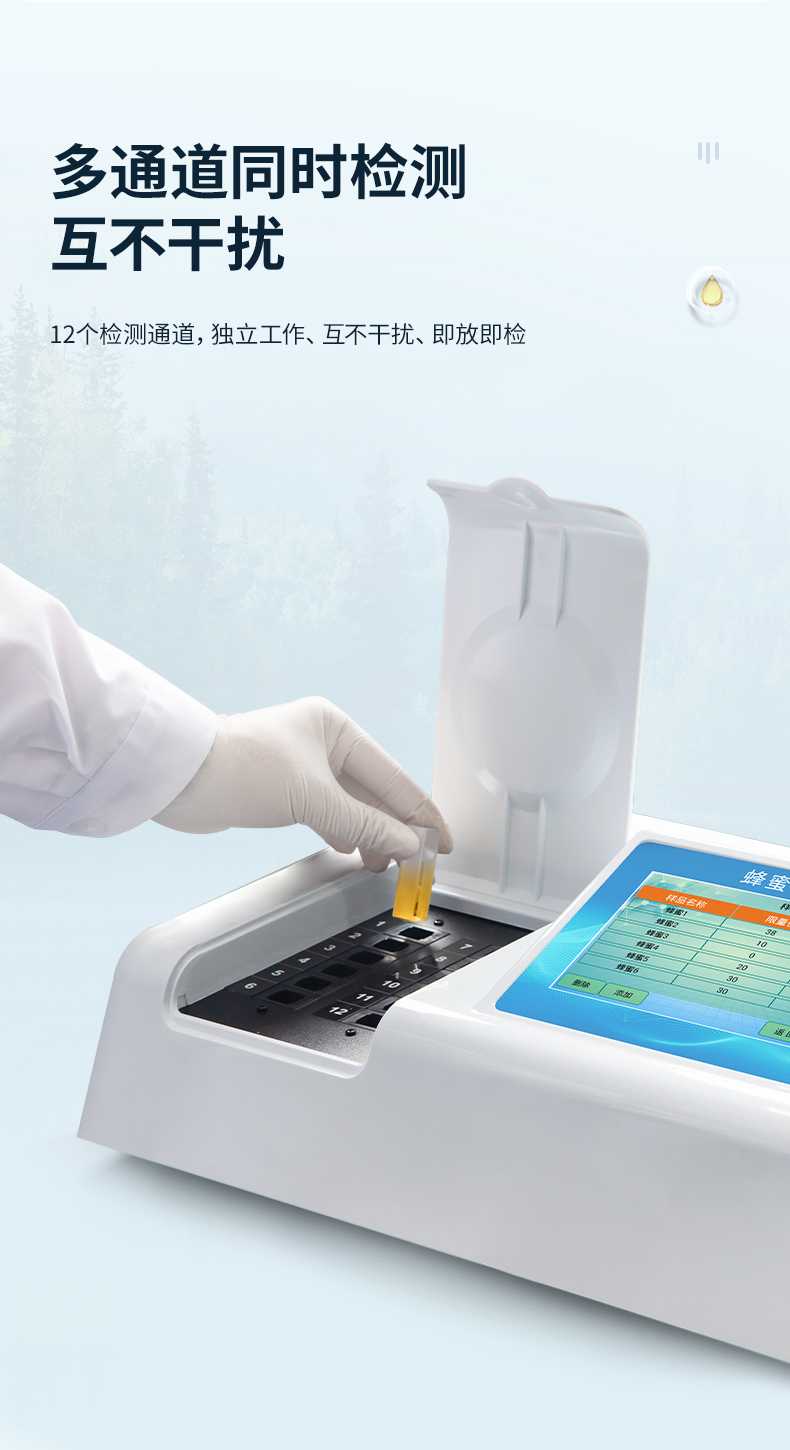檢測項(xiàng)目:蜂蜜蔗糖、蜂蜜還原糖(葡萄糖和果糖)、蜂蜜羥甲基糠醛、蜂蜜酸度、蜂蜜中農(nóng)藥殘留、蜂蜜淀粉酶值、蜂蜜中脯氨酸、蜂蜜水分、蜂蜜糖分、蜂蜜中重金屬(鉛、鎘、汞)、蜂蜜中抗生素(氯霉素、四環(huán)素、磺胺類、呋喃類、喹諾酮類)、蜂蜜中灰分,應(yīng)用范圍:應(yīng)用于現(xiàn)場檢測蜂蜜蔗糖、葡萄糖和果糖、羥甲基糠醛、酸度、農(nóng)殘、淀粉酶、脯氨酸、水分、糖分、重金屬、抗生素、灰分含量的蜂蜜快速檢測儀,可廣泛應(yīng)用于各類蜂蜜品質(zhì)的快速定量檢測。