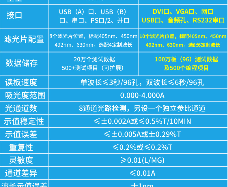 *濾光片配置:10個(gè)濾光片位置,標(biāo)配405nm、450nm、492nm、630nm,選配6定制波長(zhǎng)