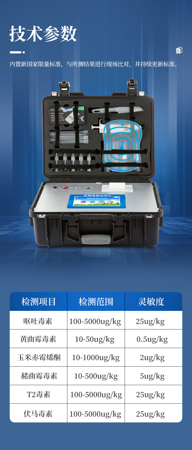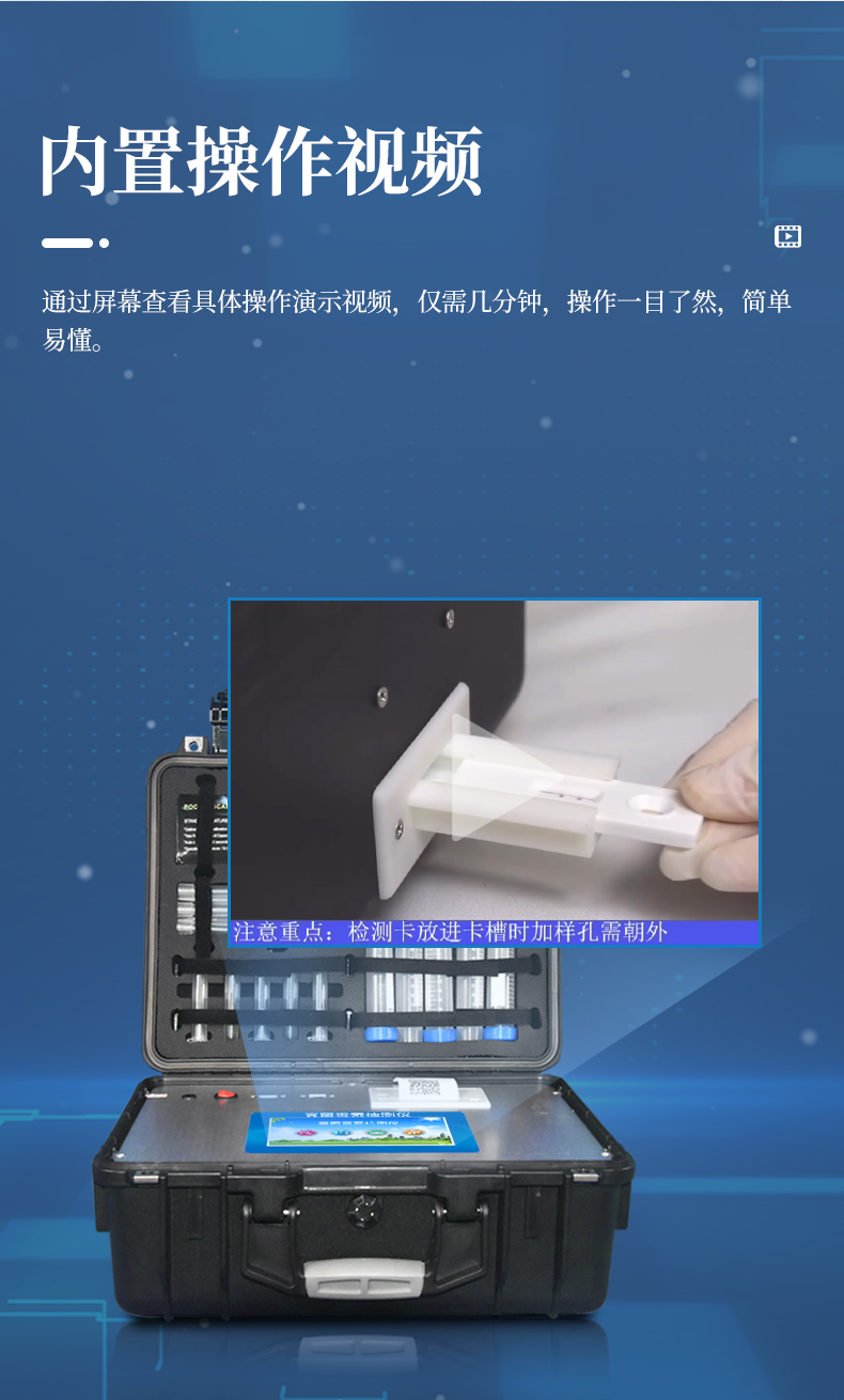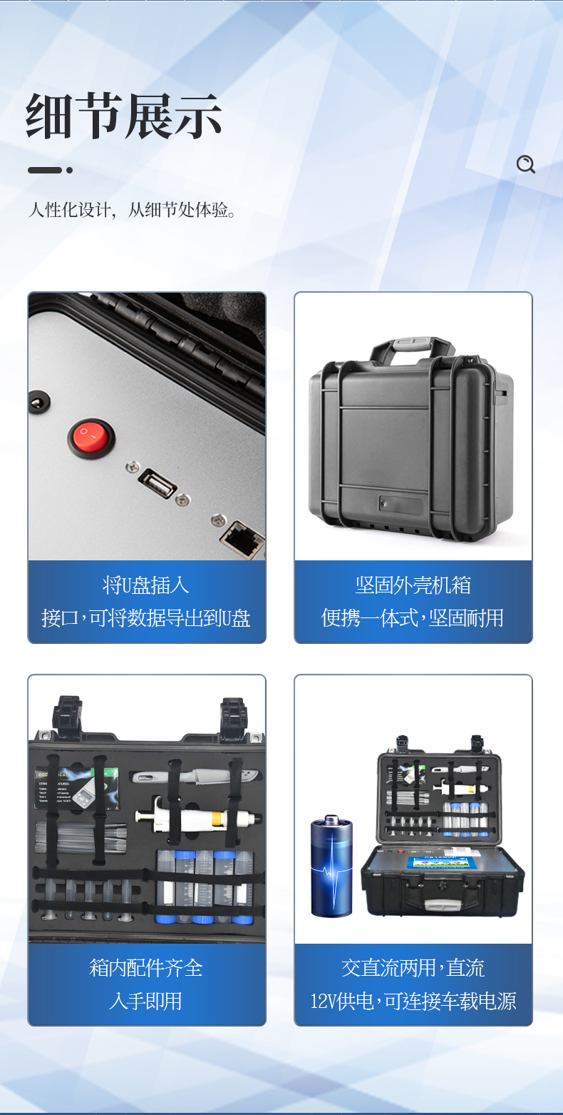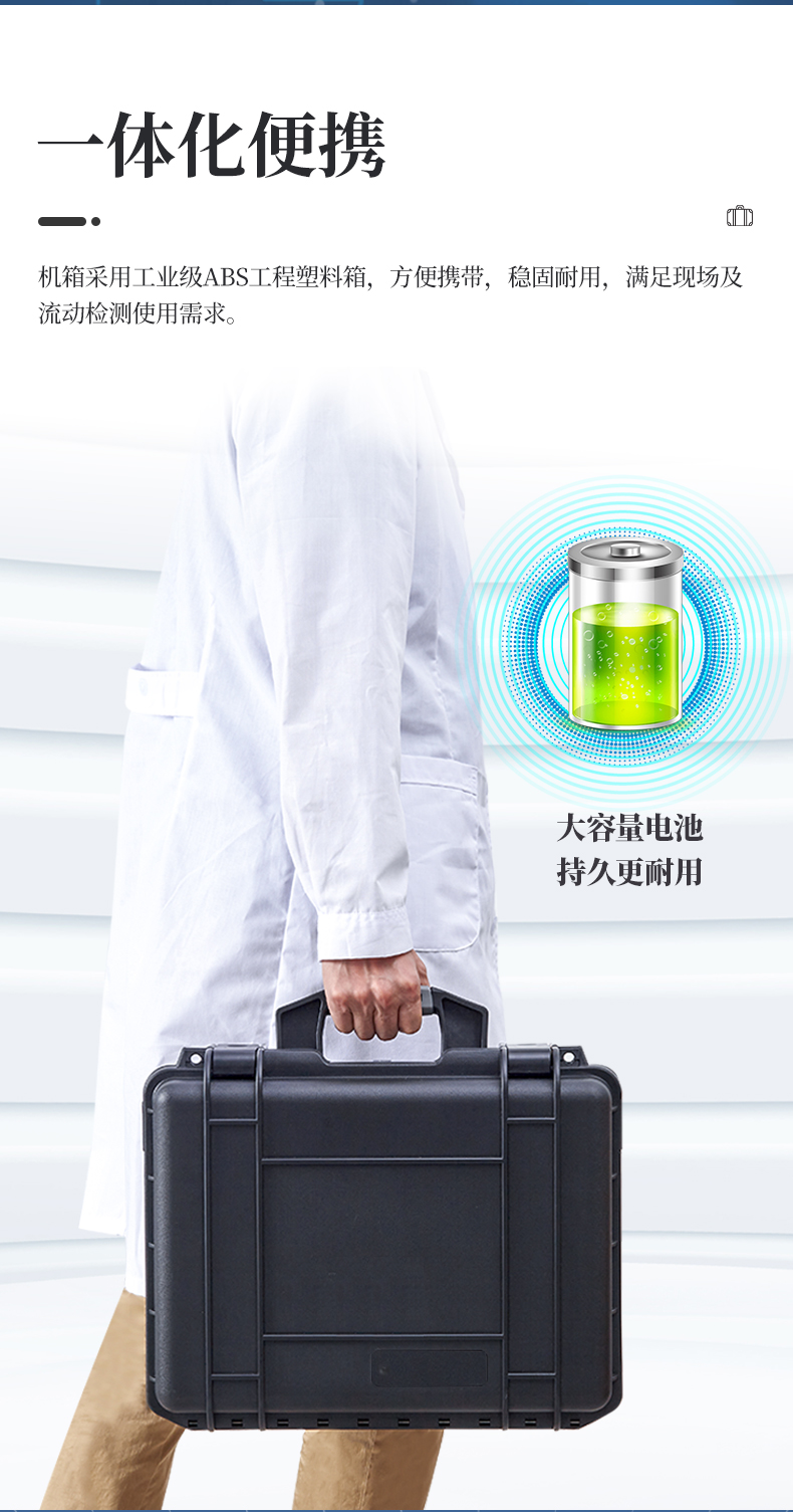 1、一體化便攜式快檢設(shè)備,機箱采用工業(yè)級ABS工程塑料箱,方便攜帶,穩(wěn)固耐用,滿足現(xiàn)場及流動檢測使用需求。
