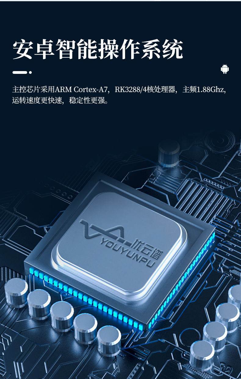 1、主控芯片采用ARM Cortex-A7,RK3288/4核處理器,主頻1.88Ghz,運轉(zhuǎn)速度更快速,穩(wěn)定性更強。