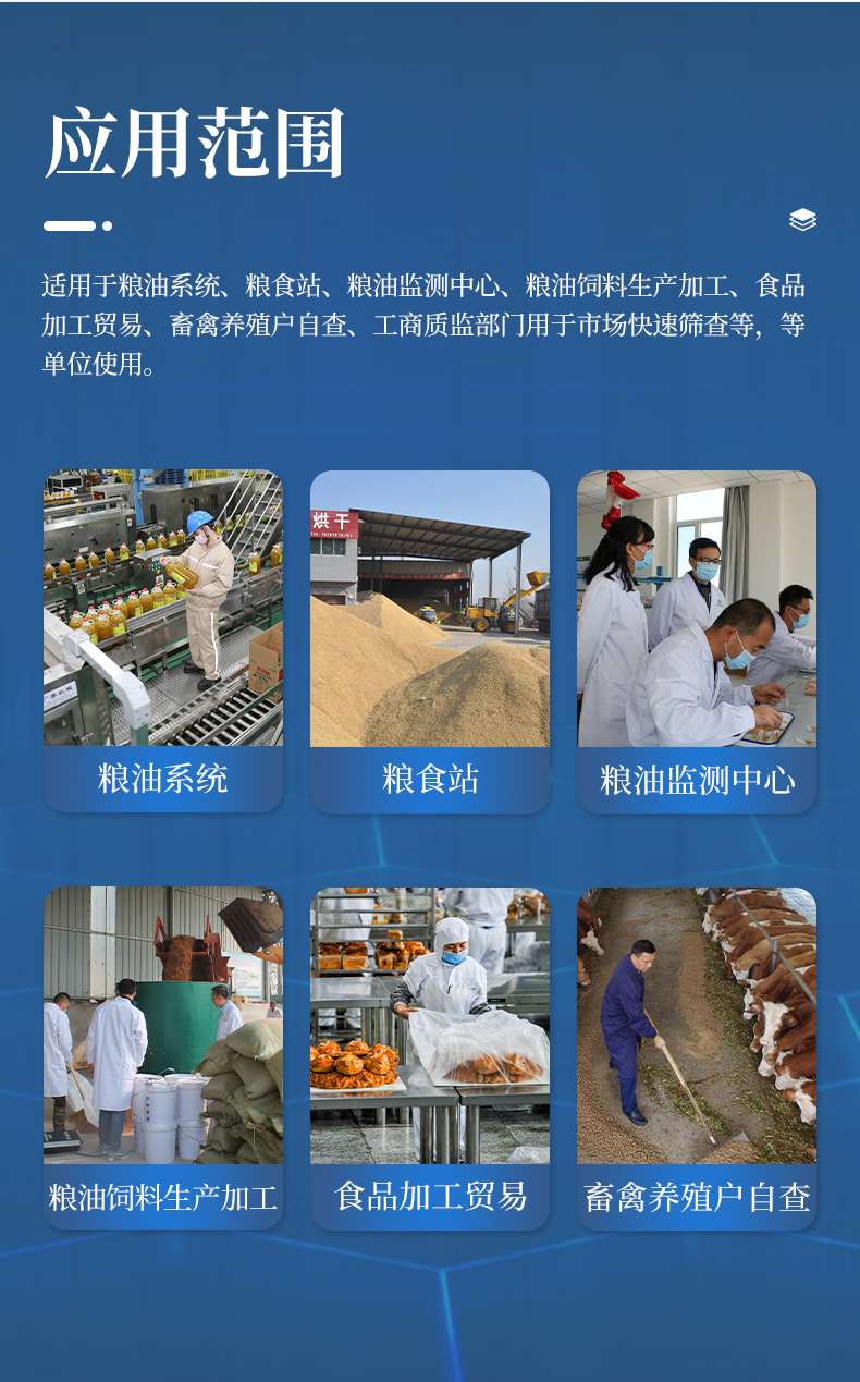 該真菌毒素檢測儀為集成化快速檢測分析設(shè)備,適用于糧油系統(tǒng)、糧食站、糧油監(jiān)測中心、糧油飼料生產(chǎn)加工、食品加工貿(mào)易、畜禽養(yǎng)殖戶自查、工商質(zhì)監(jiān)部門用于市場快速篩查等,等單位使用。