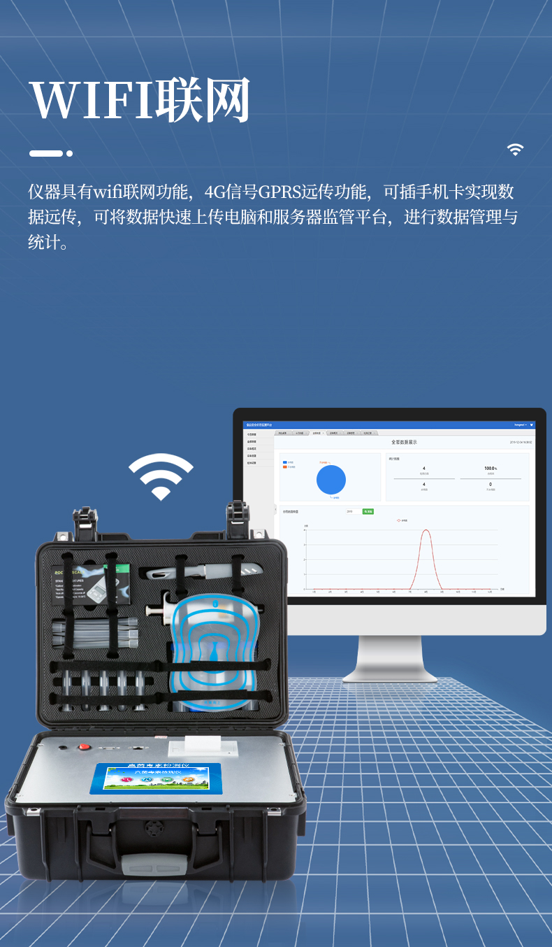 6、儀器具有wifi聯(lián)網(wǎng)功能,4G信號GPRS遠(yuǎn)傳功能,可插手機卡實現(xiàn)數(shù)據(jù)遠(yuǎn)傳,可將數(shù)據(jù)快速上傳電腦和服務(wù)器監(jiān)管平臺,進(jìn)行數(shù)據(jù)管理與統(tǒng)計。