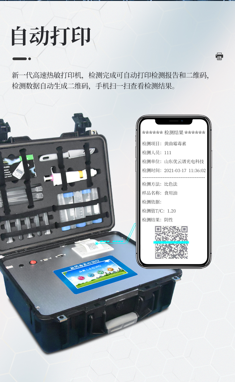 8、新一代高速熱敏打印機,檢測完成可自動打印檢測報告和二維碼。打印報告包含被測物質(zhì)、合格不合格、檢測單位、被檢查單位、檢驗員、檢測時間。