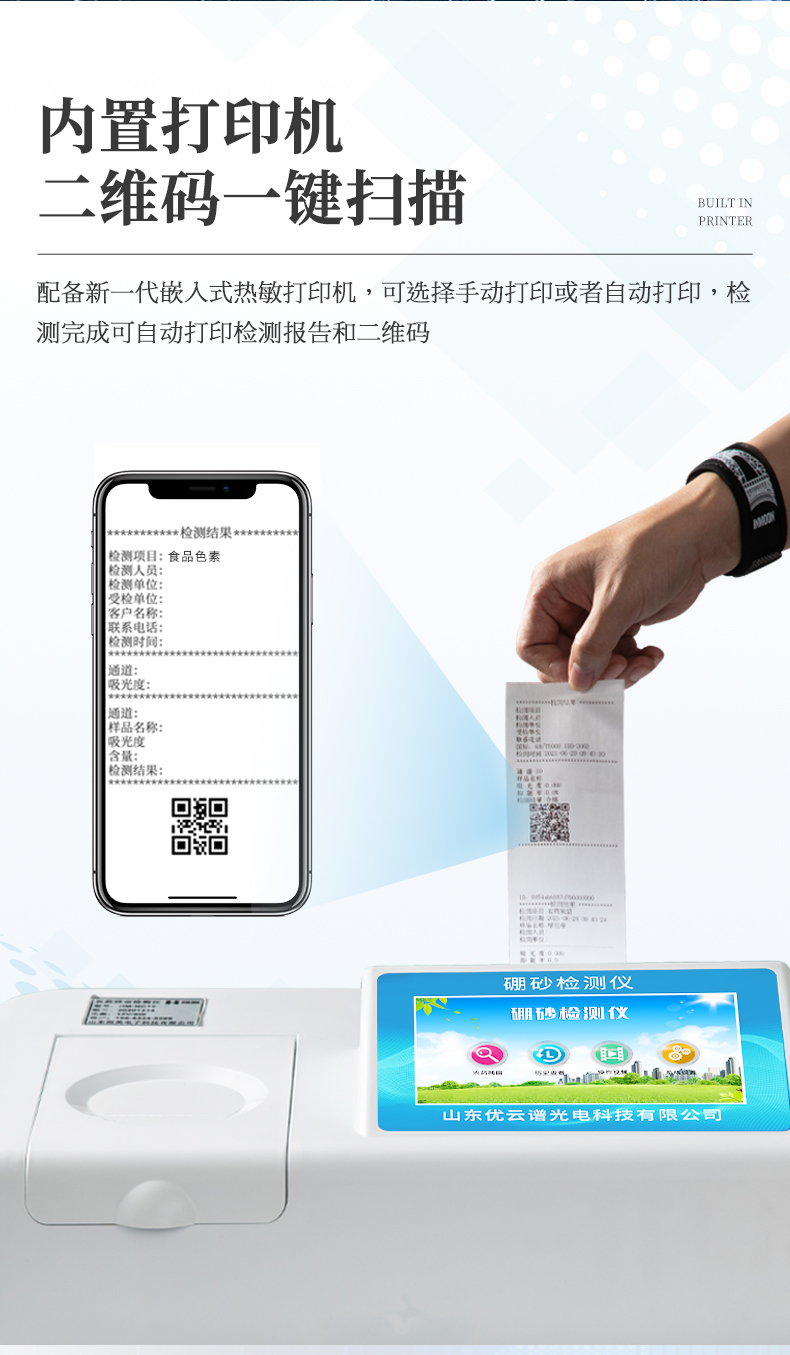 5、配備新一代嵌入式熱敏打印機(jī),可選擇手動打印或者自動打印,檢測完成可自動打印檢測報告和二維碼。