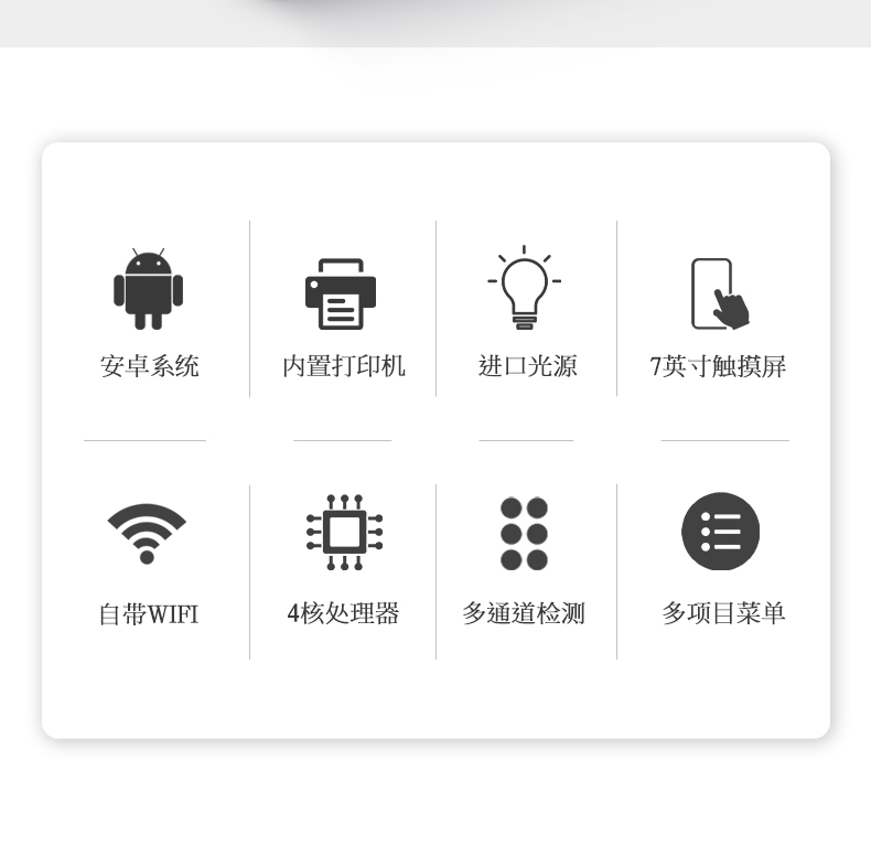 3、四波長冷光源,每個通道均配置410、520、590、630nm波長光源,標(biāo)配先進(jìn)的光路切換裝置,專利光路切換功能可實(shí)現(xiàn)最多64波長,并且所有檢測項(xiàng)目可實(shí)現(xiàn)所有通道同時檢測。