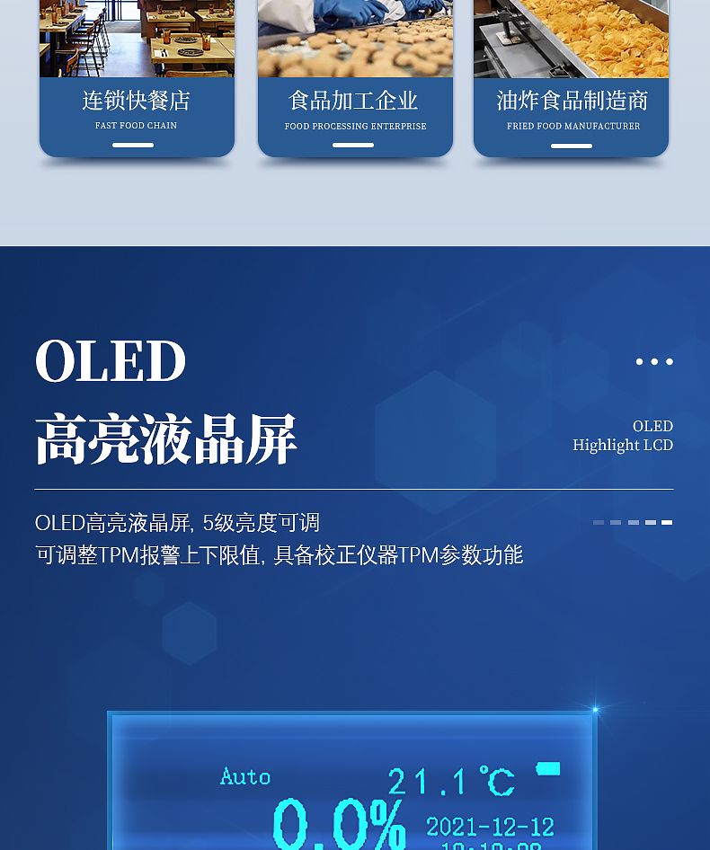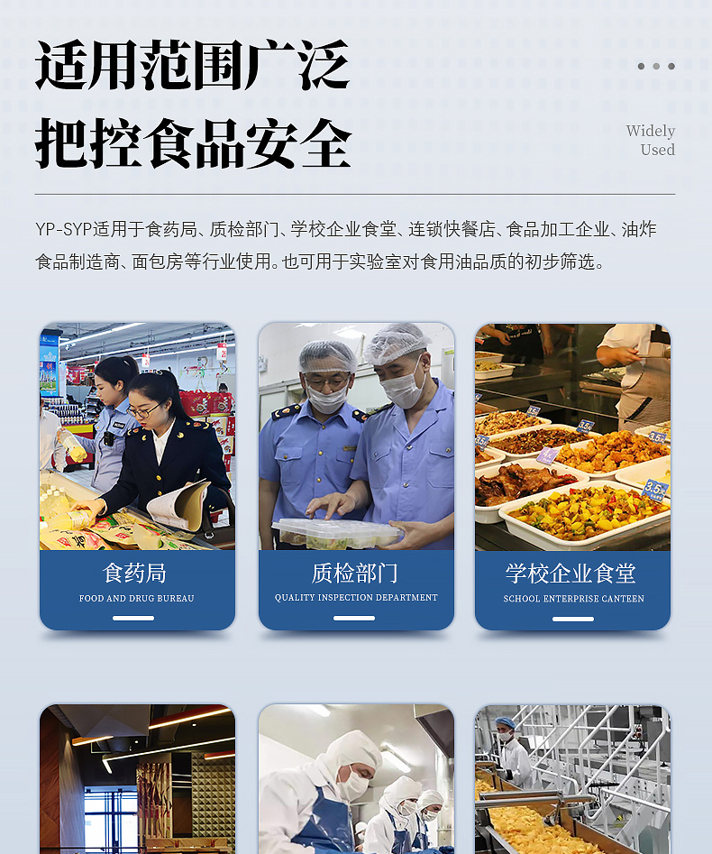 YP-SYP工業(yè)版特別適合食藥局、質檢部門、學校企業(yè)食堂、連鎖快餐店、食品加工企業(yè)、油炸食品制造商、面包房等行業(yè)使用,也可以用戶實驗室對食用油品質的初步篩選。能為您達到檢驗油品品質、節(jié)省食用油、保證產(chǎn)品的質量、保證食品安全的目的。