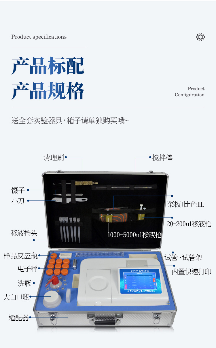 檢測(cè)標(biāo)準(zhǔn):依據(jù)國(guó)家標(biāo)準(zhǔn)方法(GB/T5009.199-2003)以及世界衛(wèi)生組織WHO、世界糧農(nóng)組織FAO殘留農(nóng)藥檢測(cè)標(biāo)準(zhǔn)、世界環(huán)境保護(hù)局EPA參照攝入量等要求來設(shè)計(jì)。采用酶抑制率比色法對(duì)水果、蔬菜等農(nóng)林產(chǎn)品中有機(jī)磷和氨基甲酸酯類農(nóng)藥含量進(jìn)行快速準(zhǔn)確的檢測(cè)。