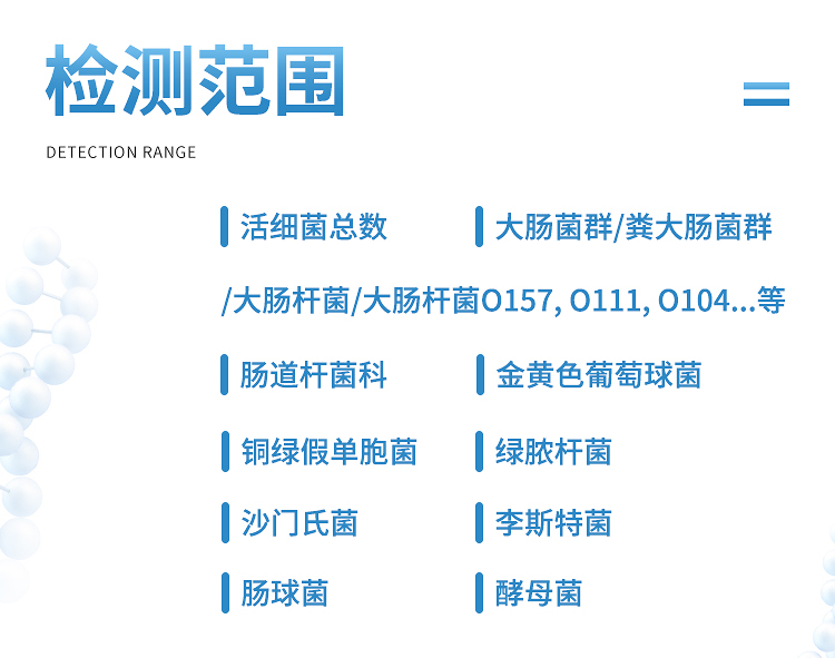 4.檢測項目:菌落總數(shù)、大腸菌群、腸球菌、大腸埃希氏菌、腸道桿菌科、綠膿桿菌、李斯特菌、金黃色葡萄球菌、沙門氏菌、酵母菌等微生物。